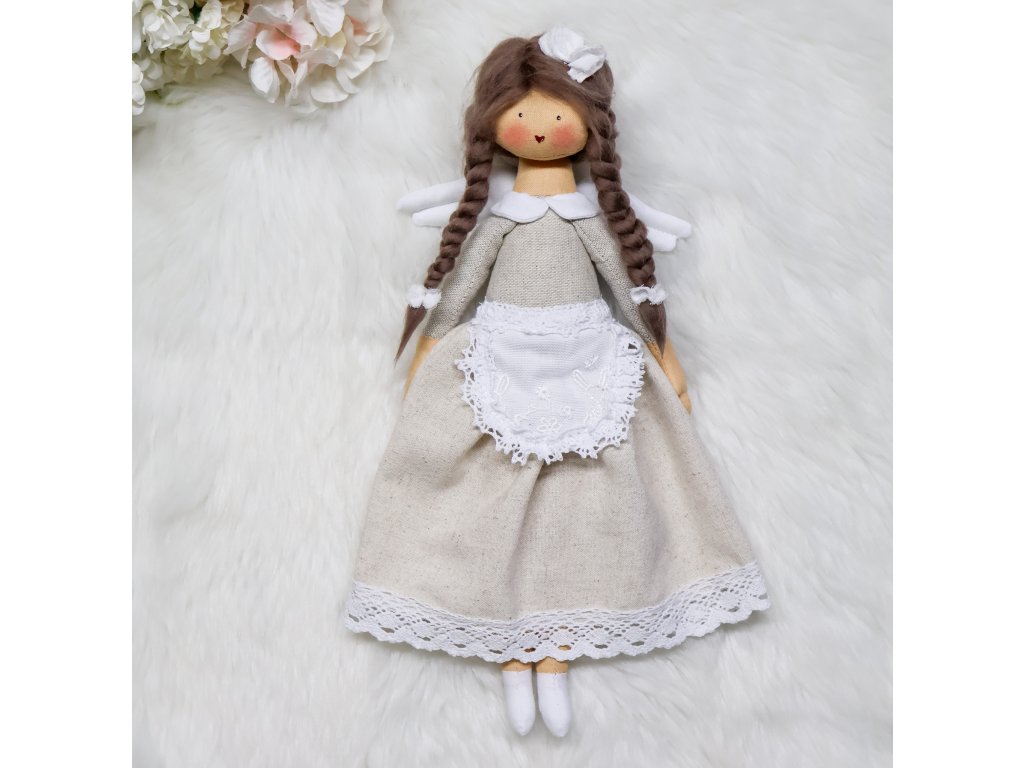 Panenku zdobí sukně z příjemného odlehčeného lnu a zástěrka s krajkou.
