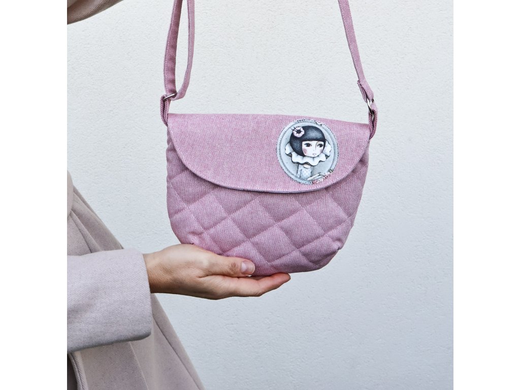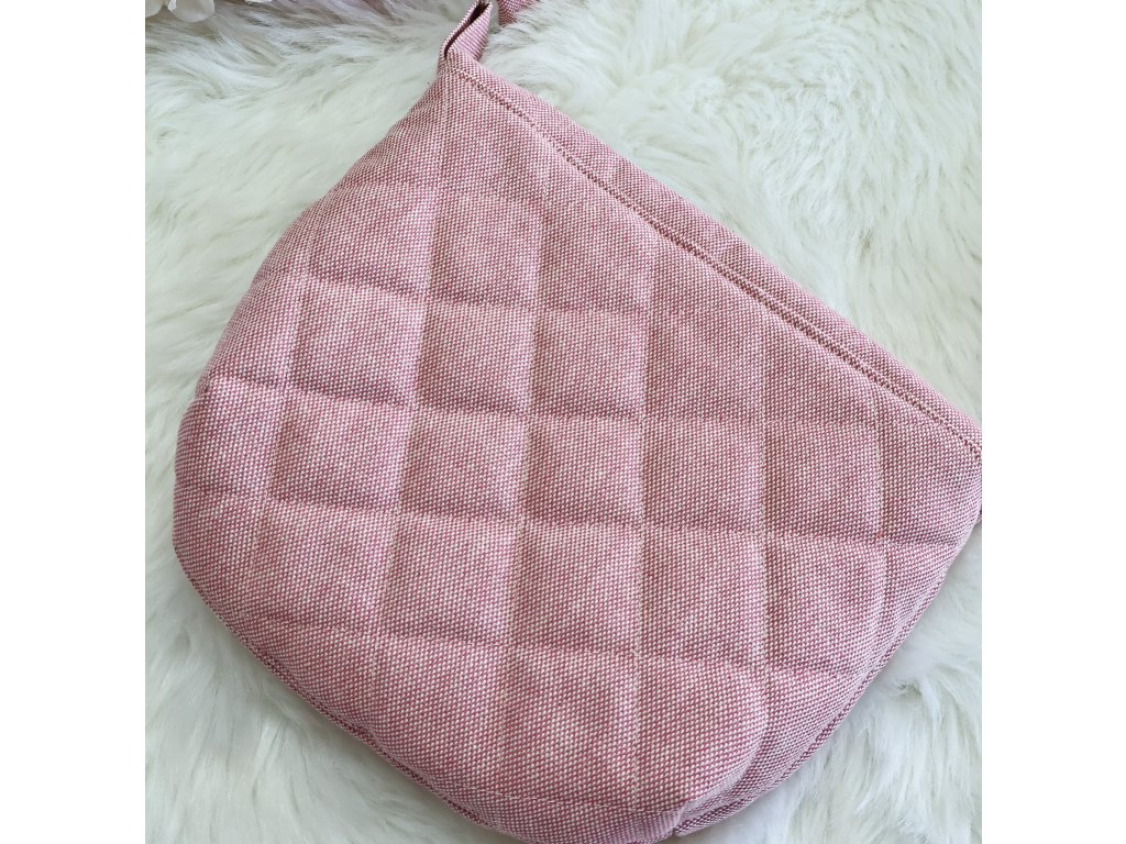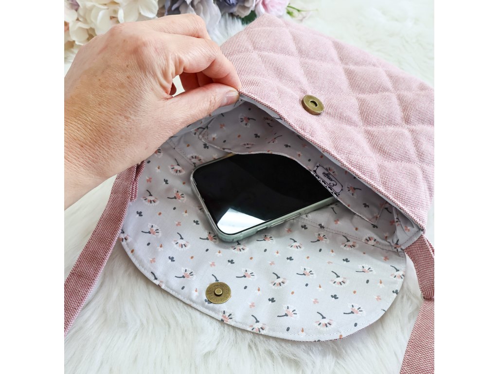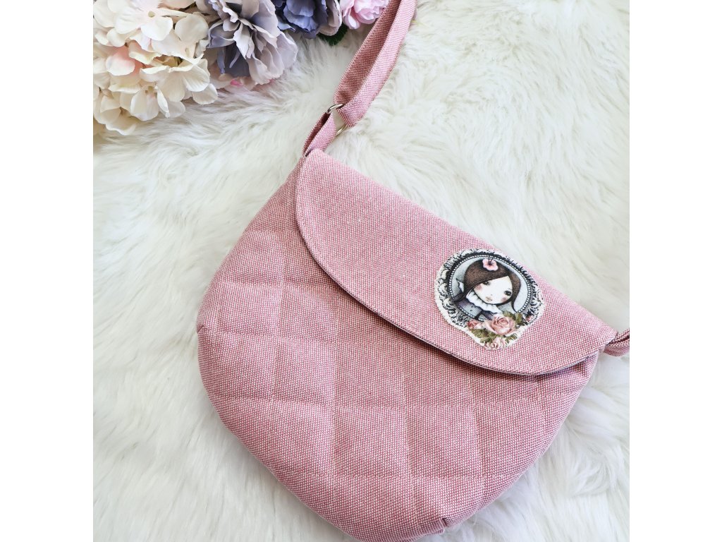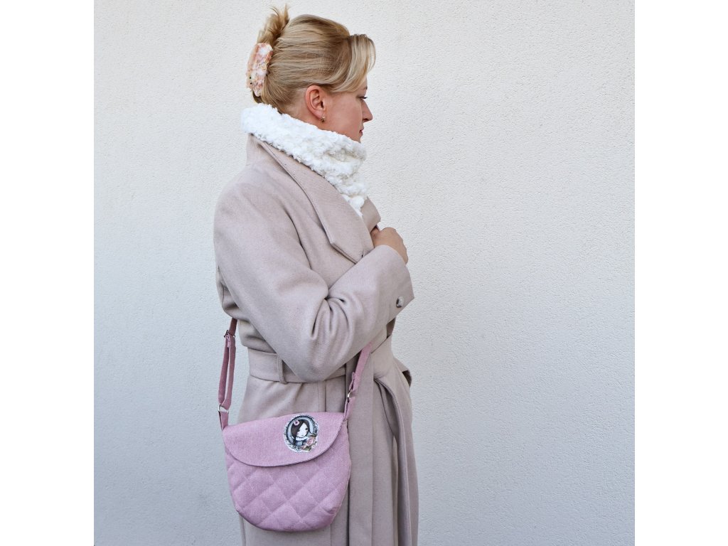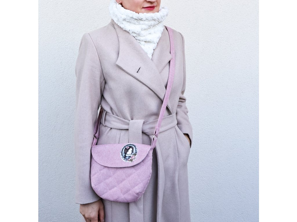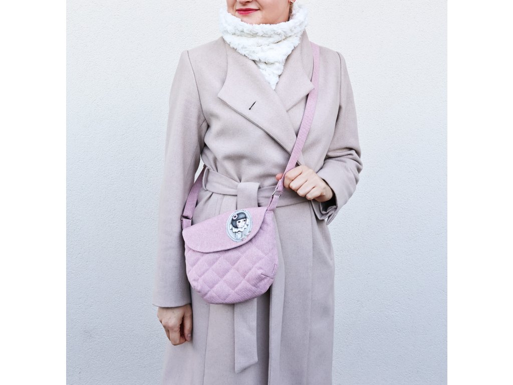 Kabelka Olivie je ušitá z pevné růžové látky potahového typu, podložená výztuhou a celá ozdobně prošívaná.