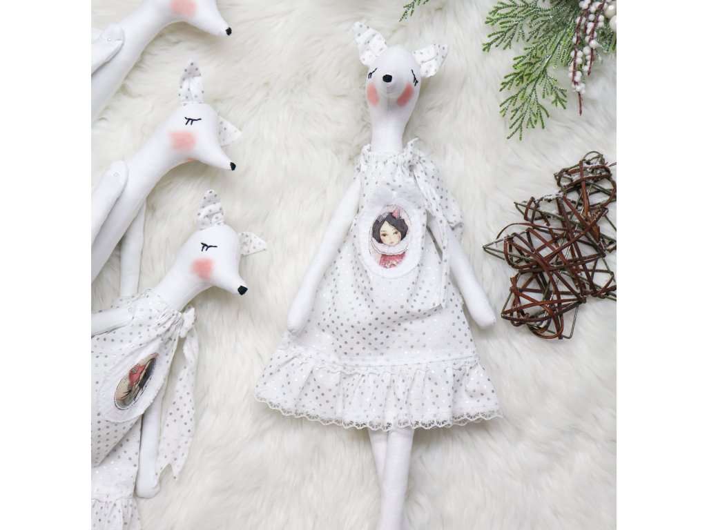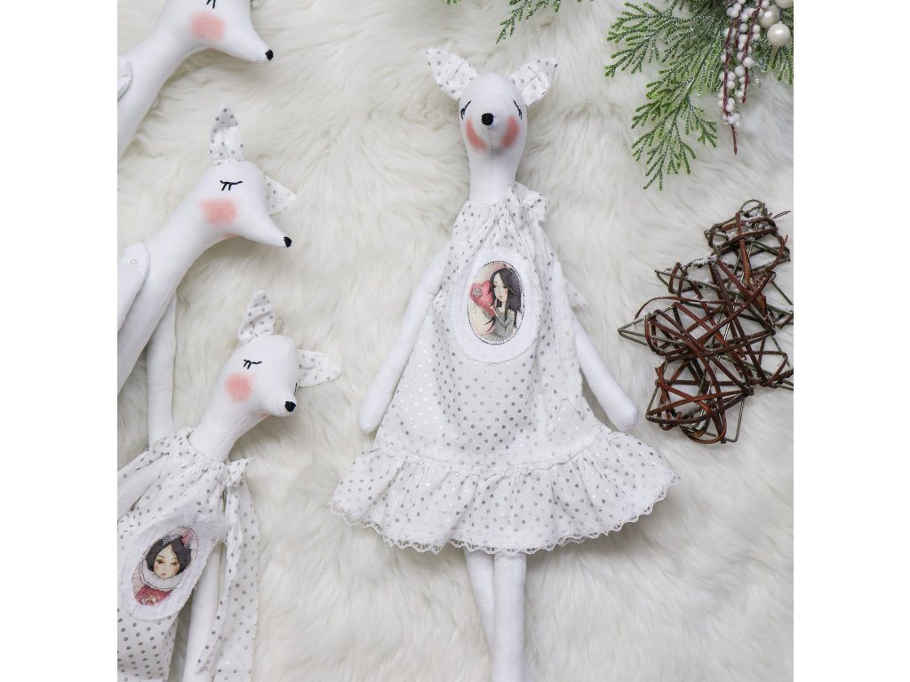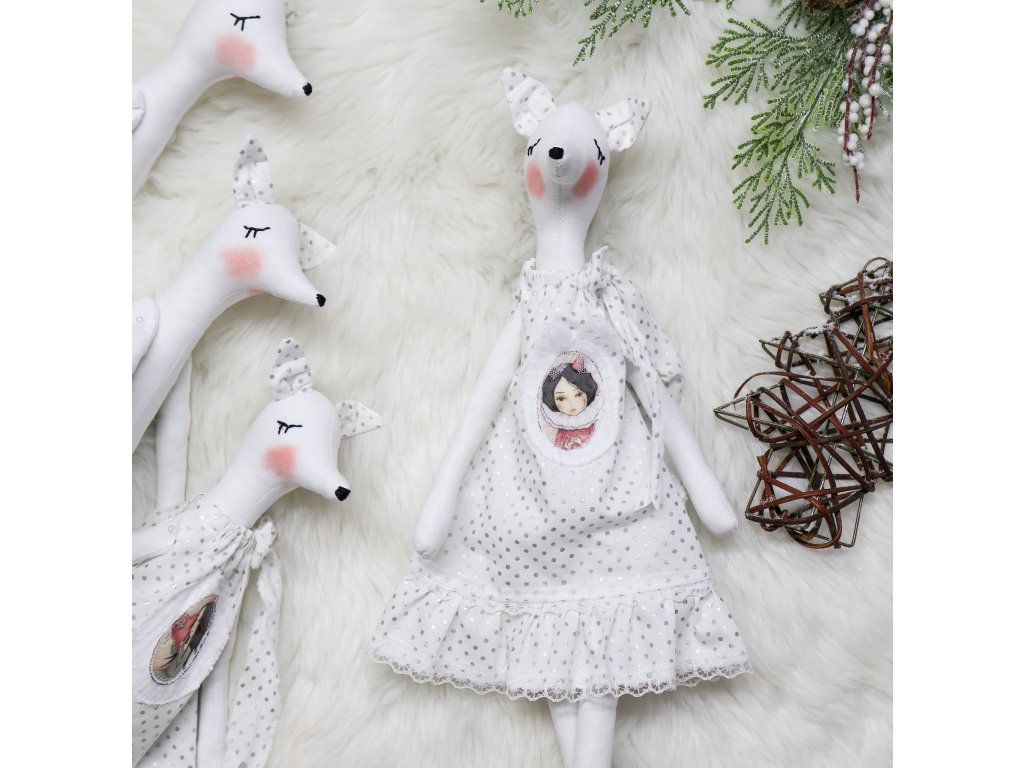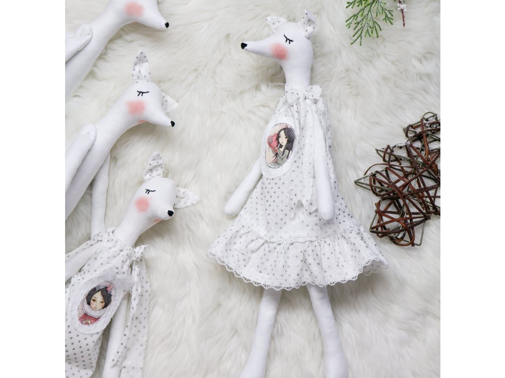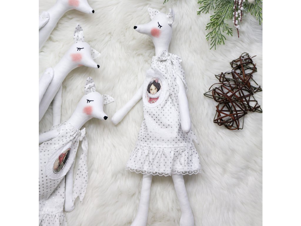 Každá liška je ušitá z kvalitní bavlněné látky a oblečená do jemných šatiček se stříbrnými puntíky.