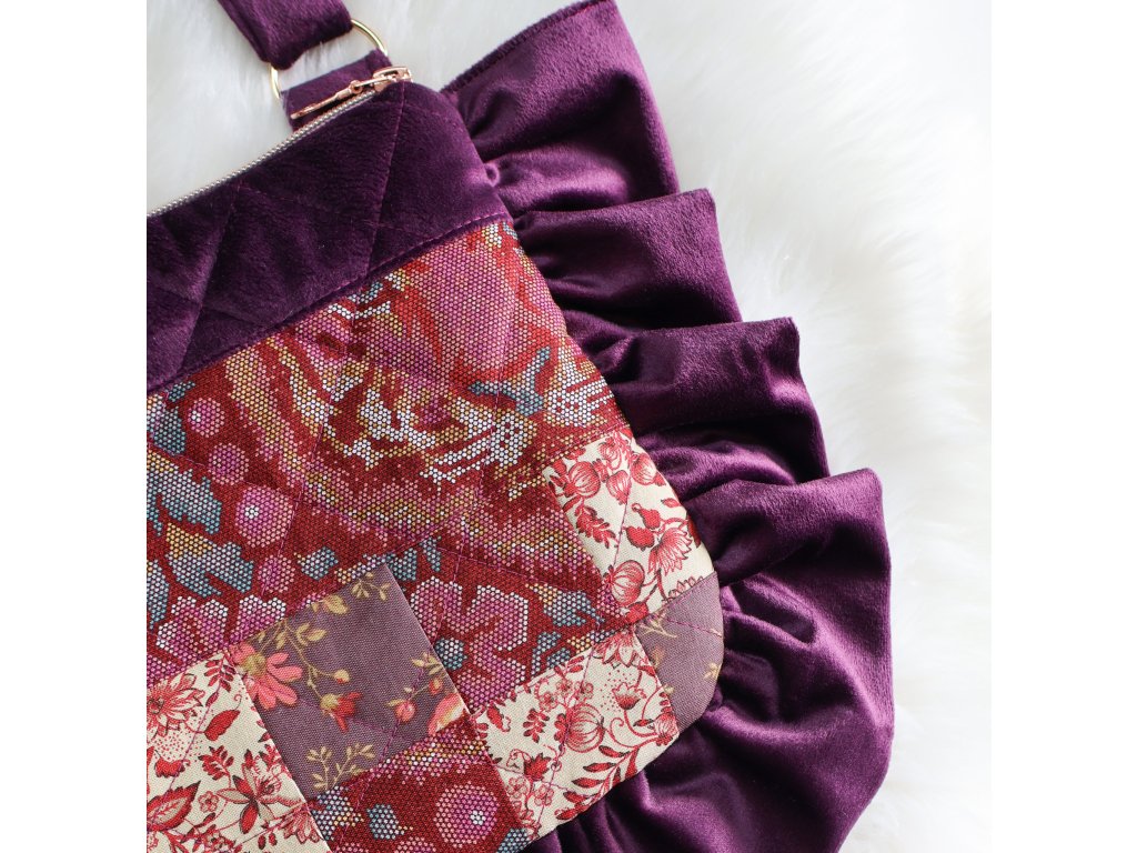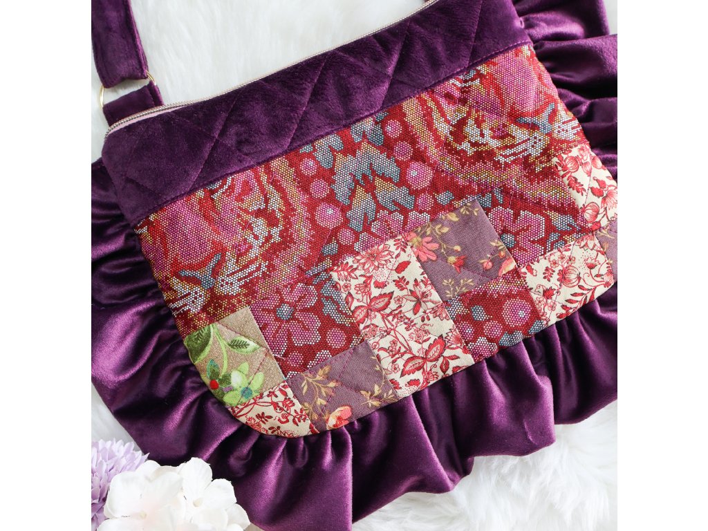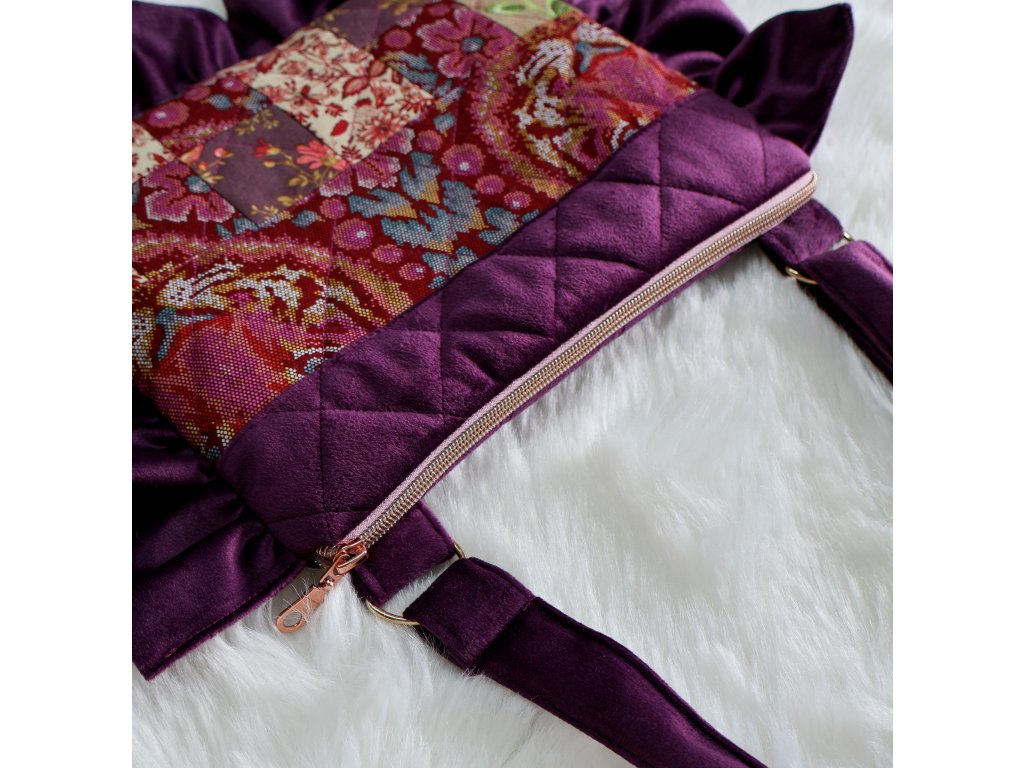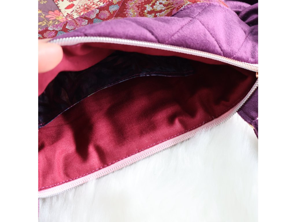 Samet v odstínu fialové, kousky designových látek k sobě sešitých, aby vytvořily neokoukaný a luxusní dojem.