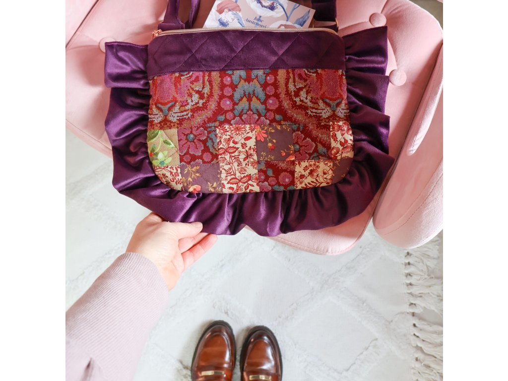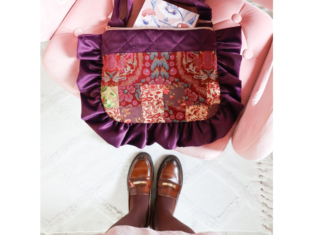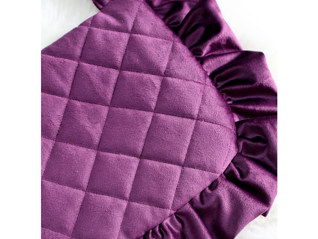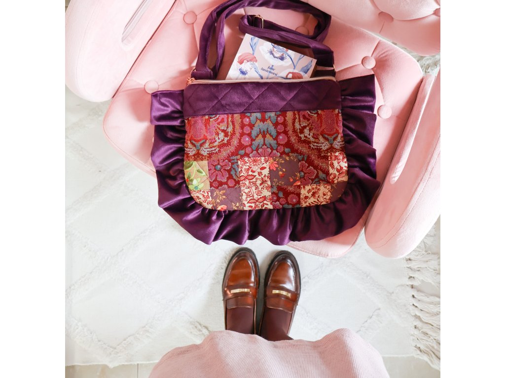 Samet v odstínu fialové, kousky designových látek k sobě sešitých, aby vytvořily neokoukaný a luxusní dojem.