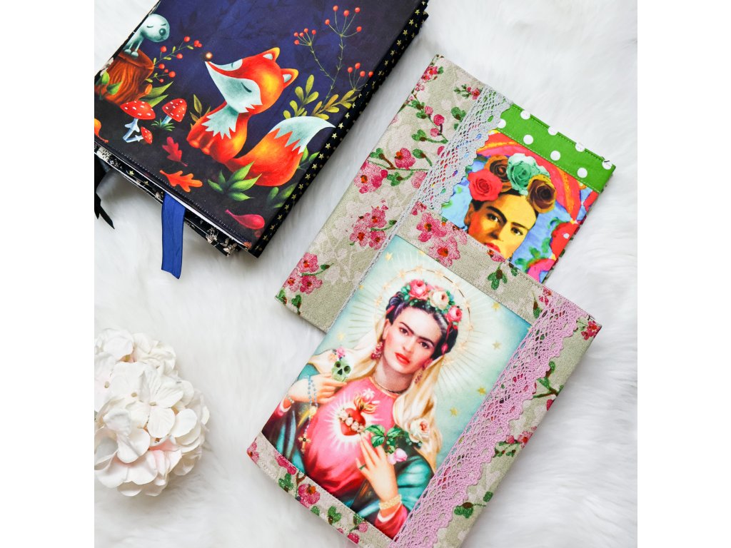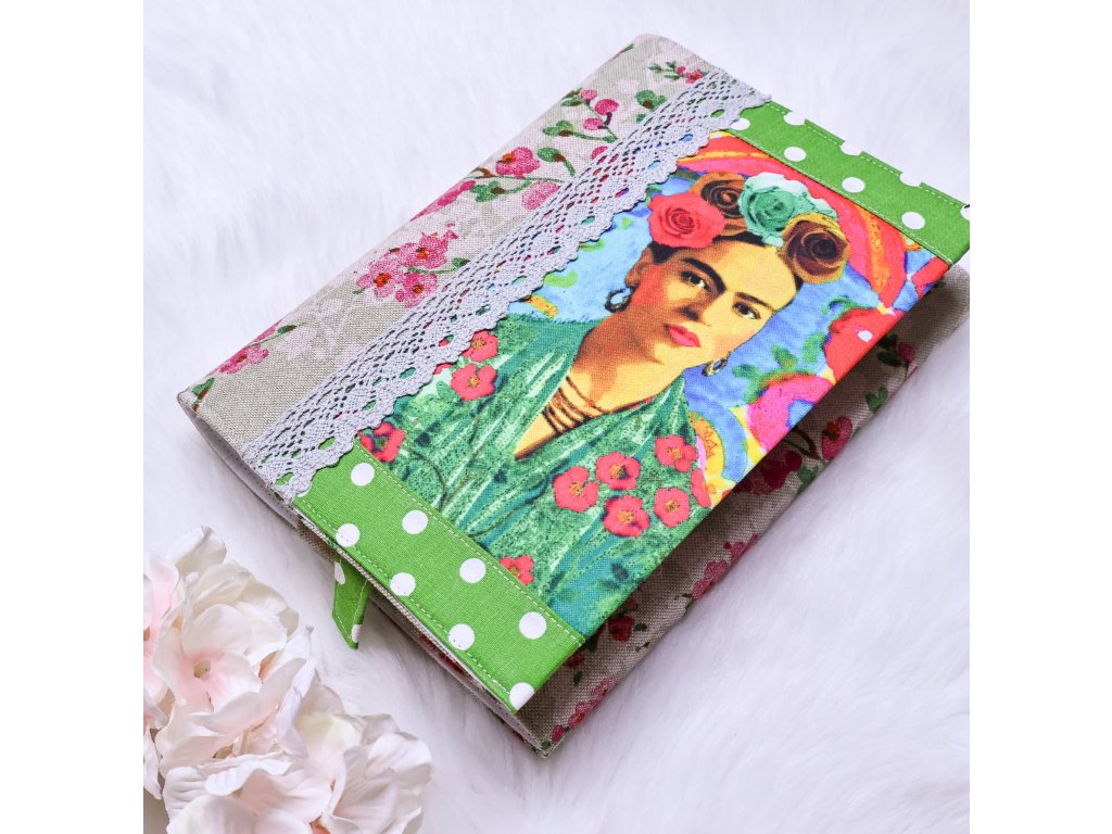 - Obal Frida Kahlo se zeleným puntíkem, zadní strana květovaná, pro max. výšku knížky 23 cm