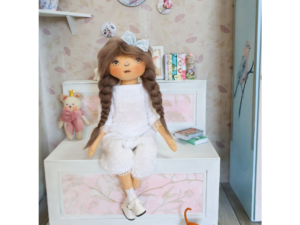 Jedná se o dekorační předmět, panenka se nepere. V případě potřeby jemně otřít vlhkým hadříkem. Oblečení lze prát ručně na 30 stupňů, nechat volně uschnout, žehlit na bavlnu.
