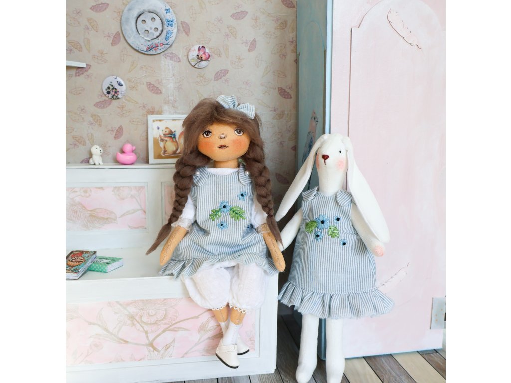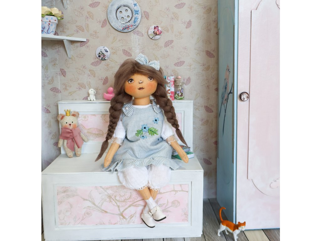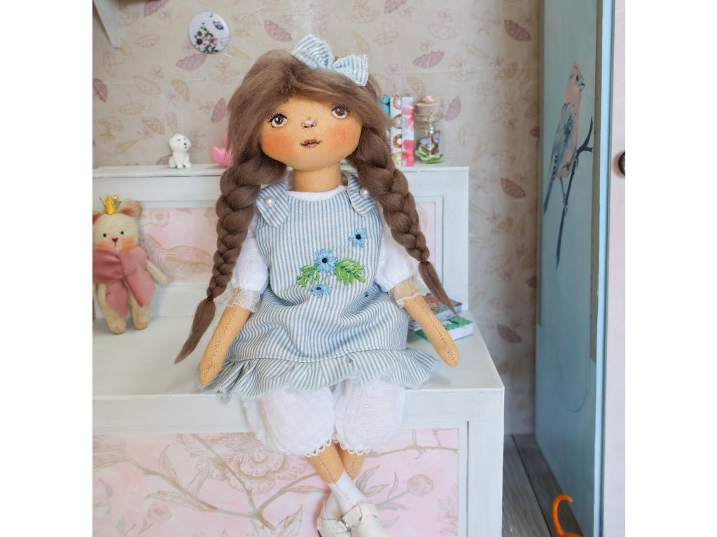 Alenka je ručně šitá sběratelská panenka s malovaným obličejem.