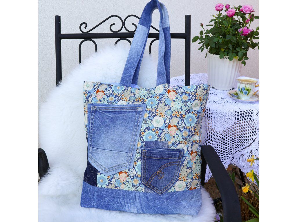 Nastříhané kousky látek jsem k sobě sešila, zpevnila měkkou výztuhou a následně celou tašku strojově prošila.