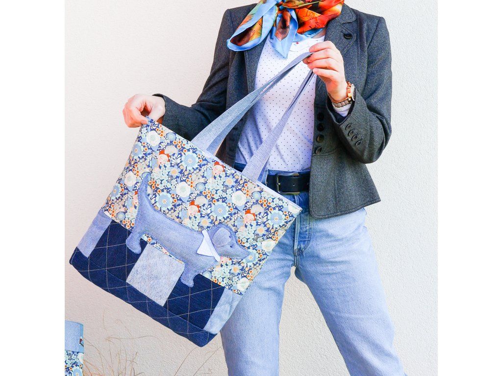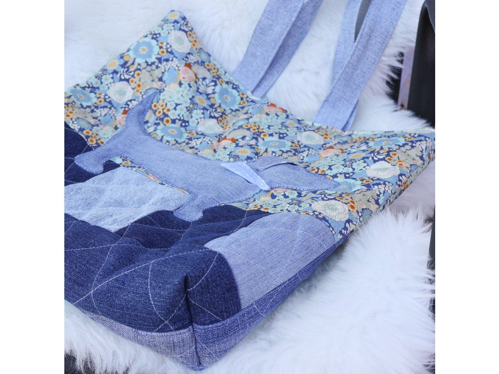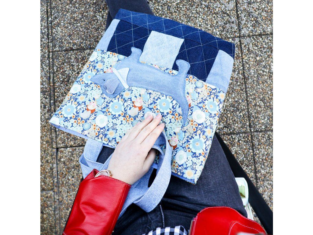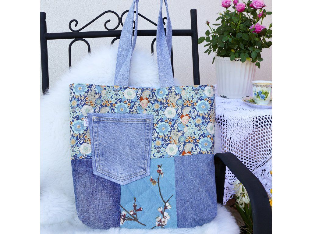 Nastříhané kousky látek jsem k sobě sešila, zpevnila měkkou výztuhou a následně celou tašku strojově prošila.
