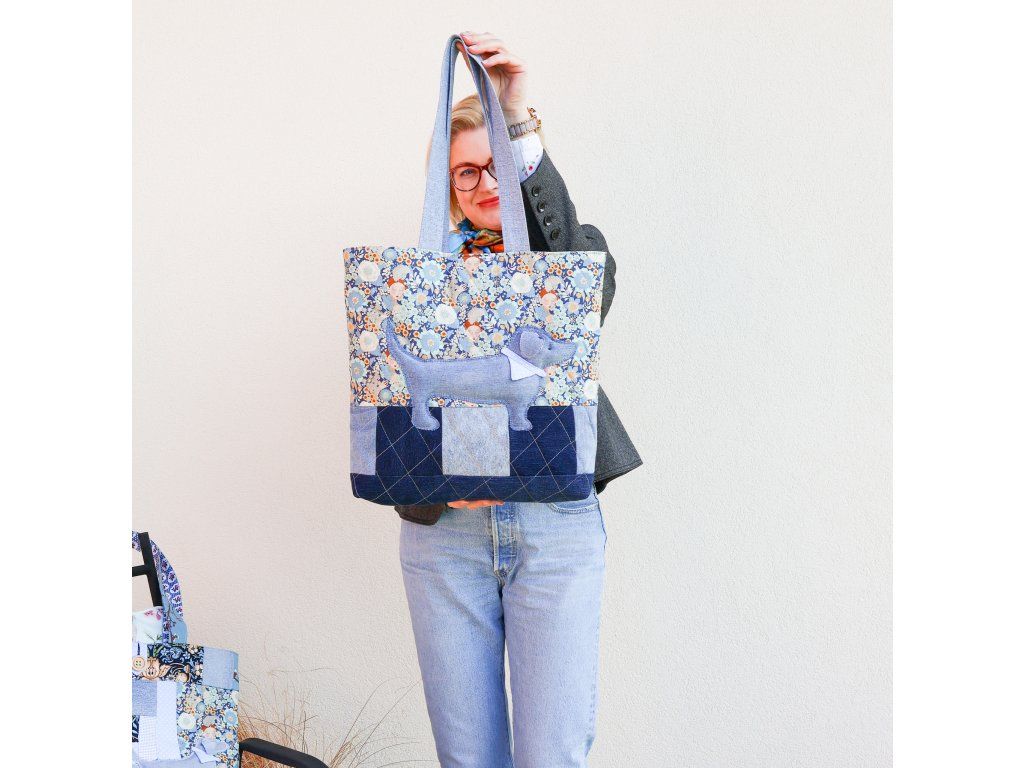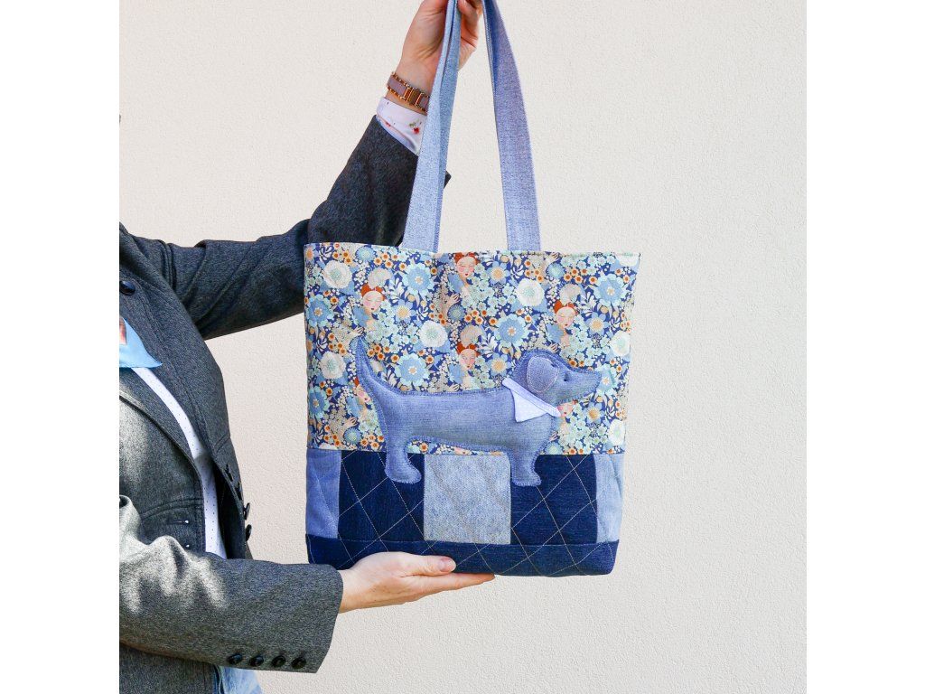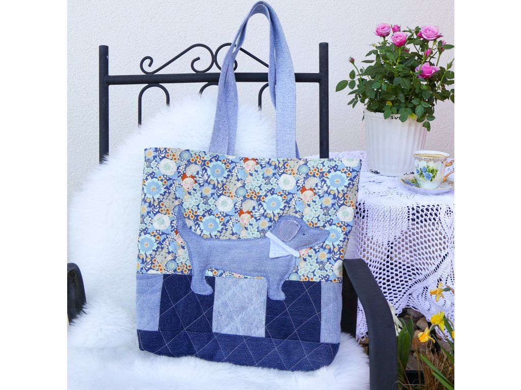 Patchworková kabelka s jezevčíkem - Modrá zahrada