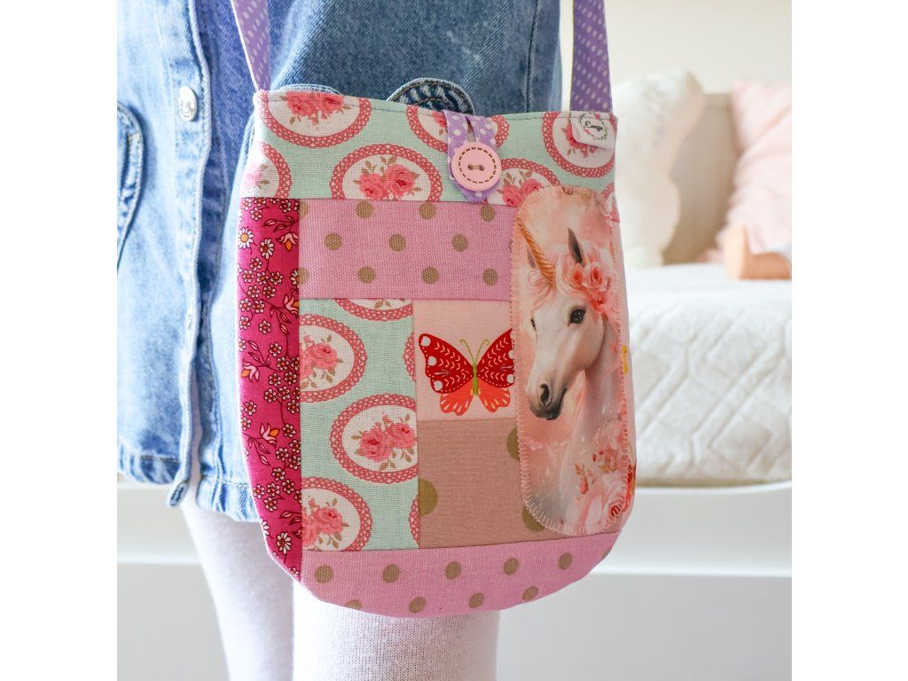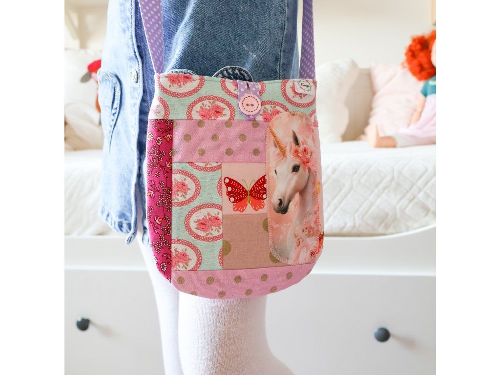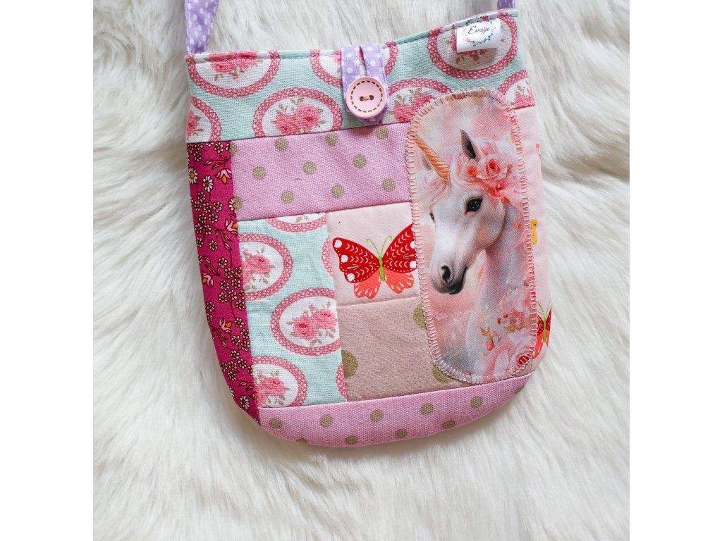 - Kabelka s jednorožcem - s fialovým puntíkatým popruhem, který je dlouhý 98 cm