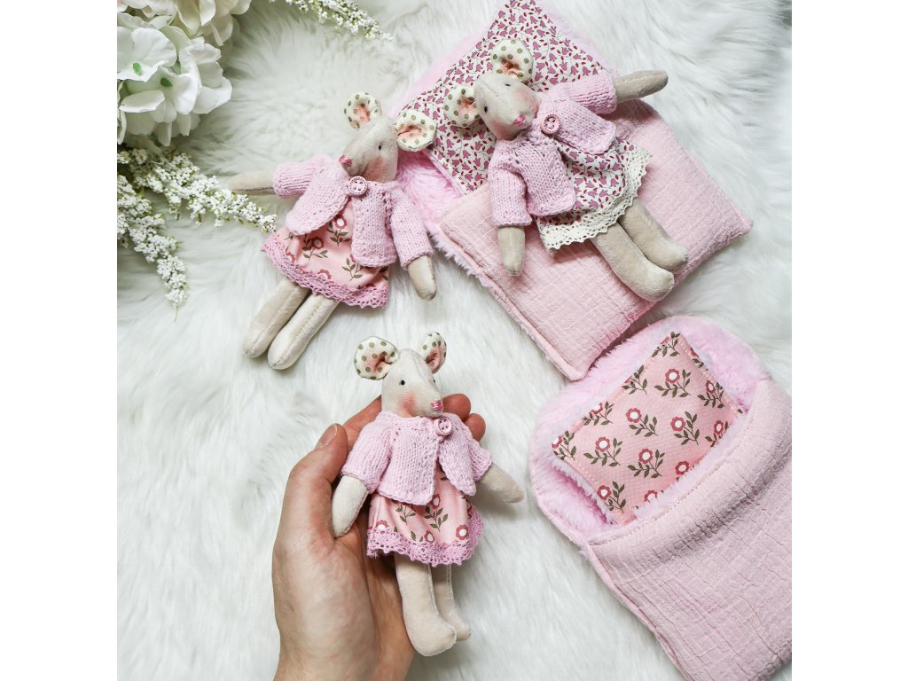 Romantické šatičky a ručně pletený svetřík dodávají myšce neodolatelný šarm.