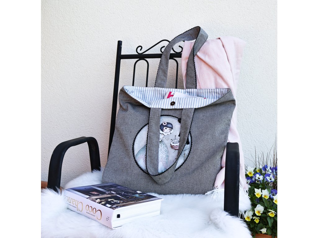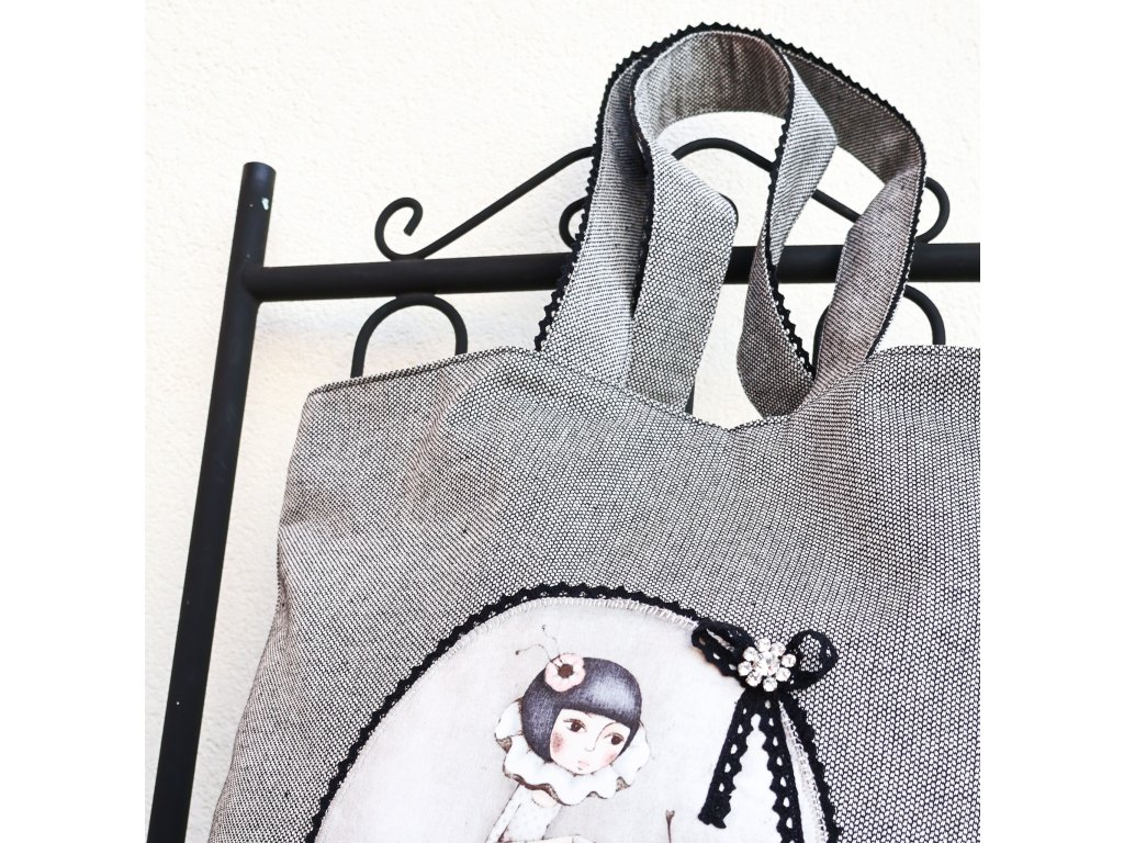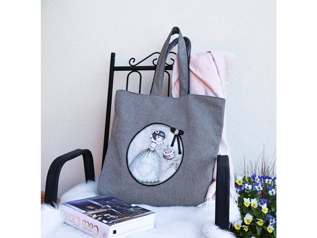 Kabelka zaujme na první pohled originální aplikací s motivem éterické dámy.