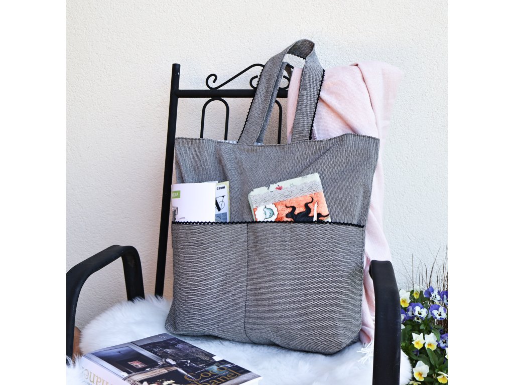 Rozměry kabelky: výška 43 cm, šířka 46 cm, hloubka 10 cm, ucha dlouhá 62 cm.